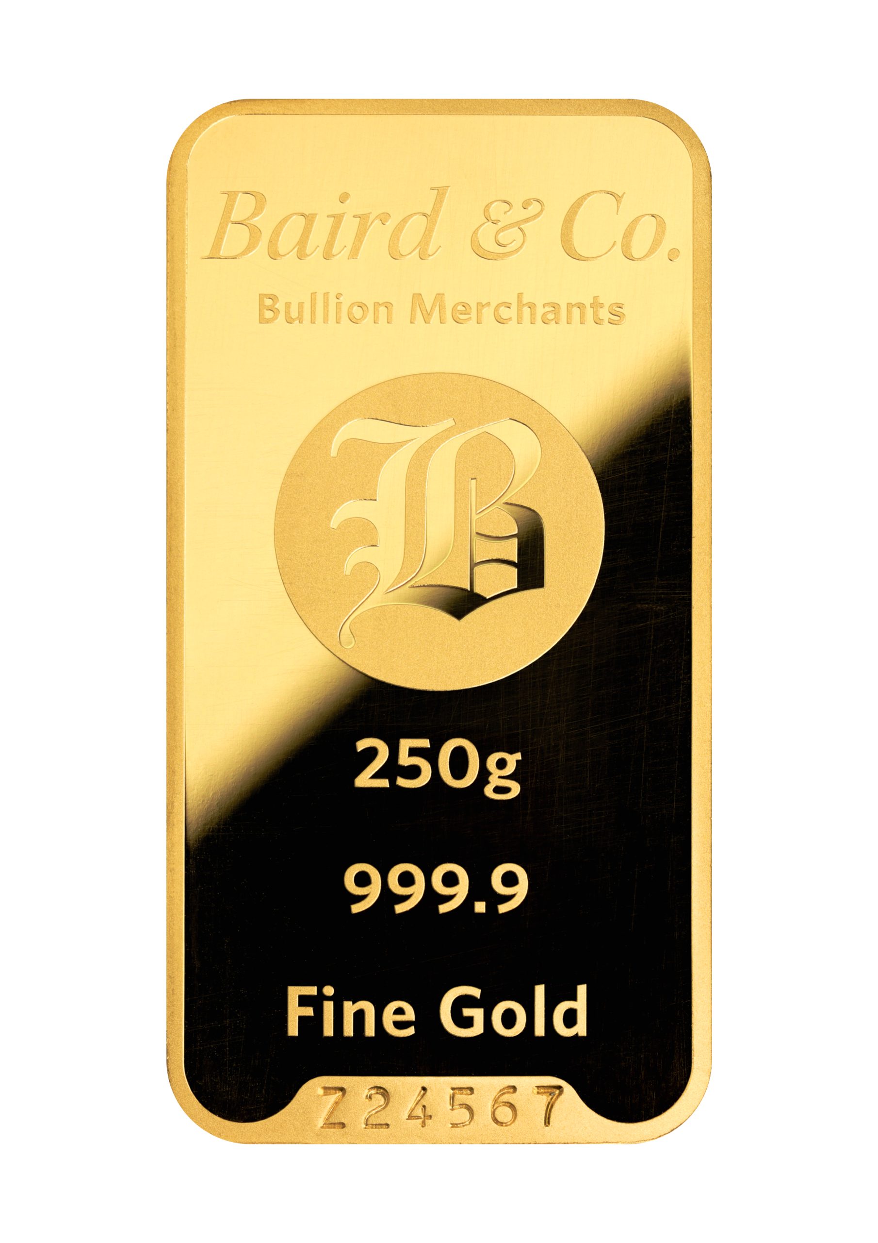 The Baird & Co. 250g gold minted bar is produced at our internationally recognised London refinery. This bar is produced to the internationally recognised 999.9 standard and carries the Baird & Co. mark, the weight, fineness and a unique serial number. Bars are supplied in sealed, tamper resistant packaging.